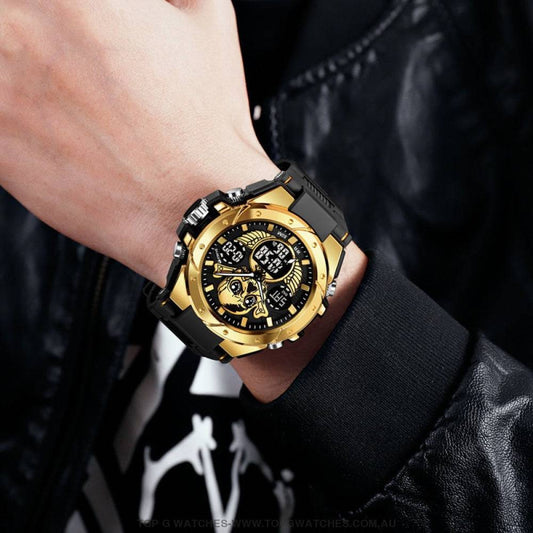 STRYVE Skull-Concept Dual Display Watch – Gold Finish, Digital & Analog, 50 M Waterproof